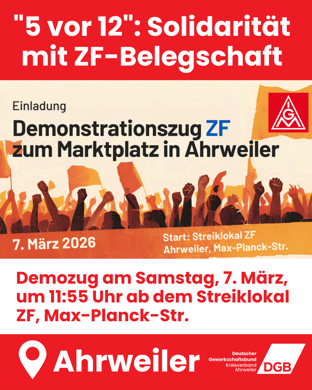 Alle sind eingeladen: Demozug am Samstag, 7. März 2026, um 5 vor 12 Uhr ab dem Streiklokal ZF (Max-Planck-Str.).
