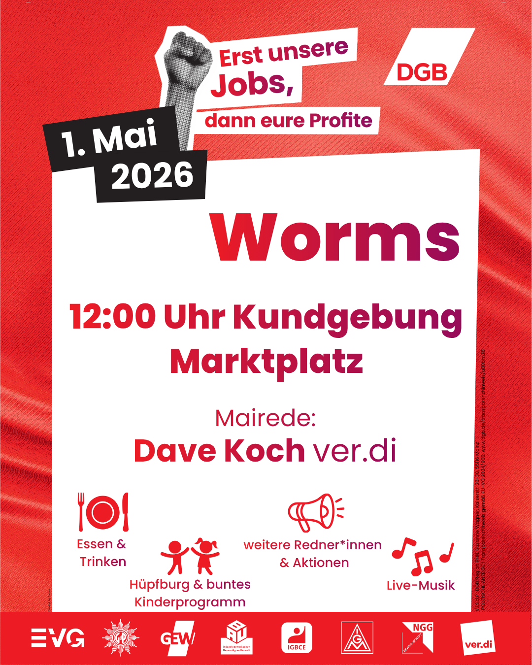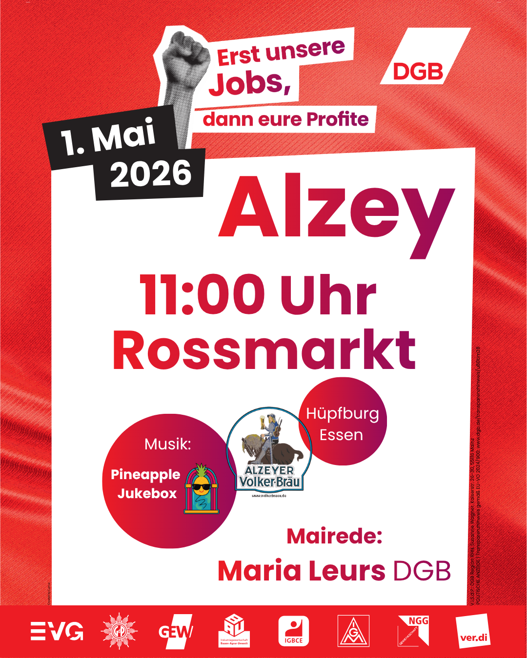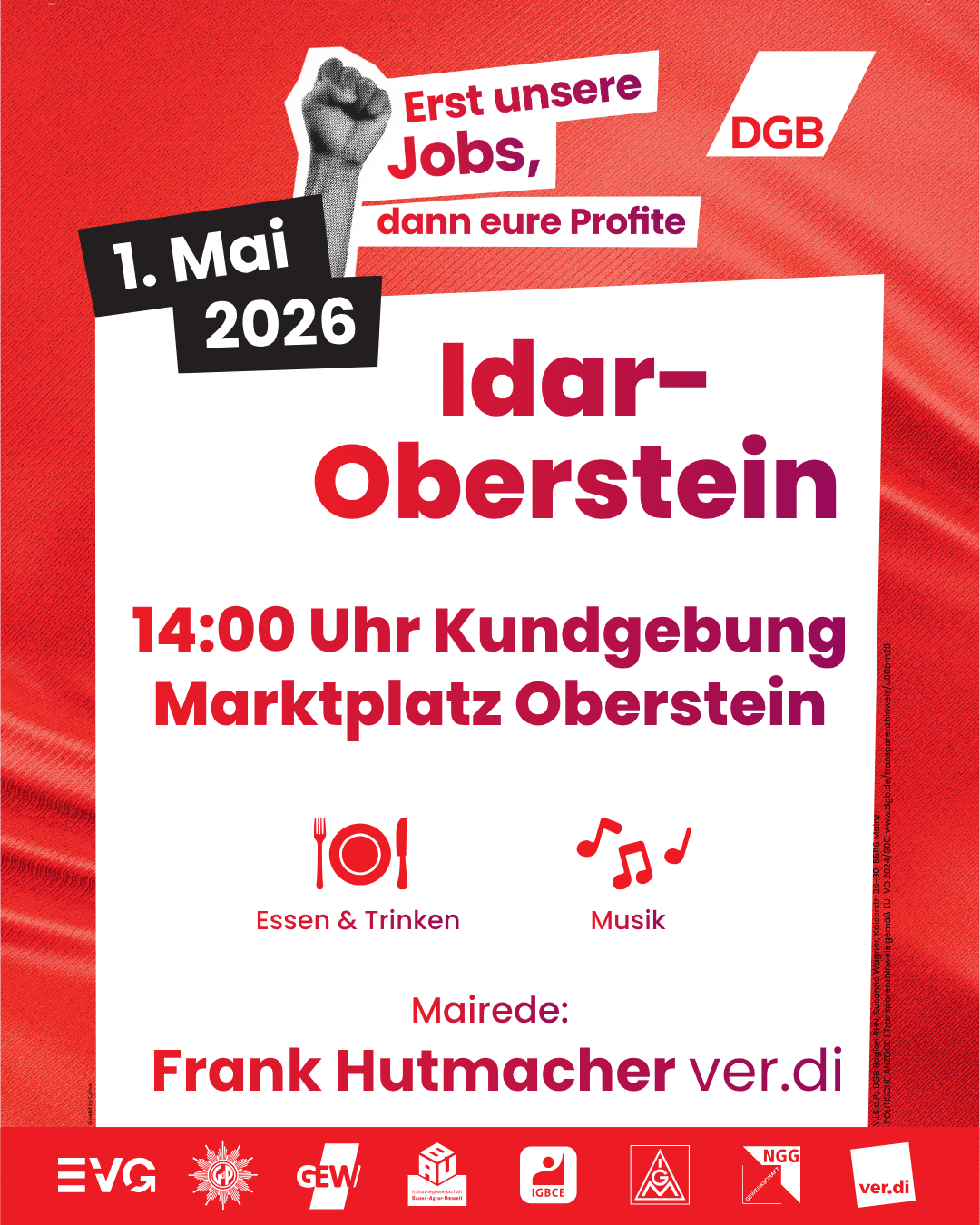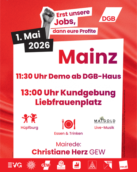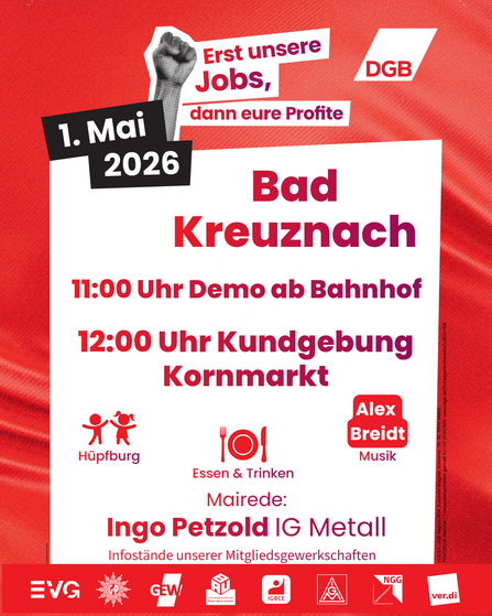“Erst unsere Jobs, dann eure Profite” ist unser Motto zum 1. Mai 2026. Arbeitsplätze geraten unter Druck, Standorte werden verlagert, soziale Sicherheit wird infrage gestellt. Gleichzeitig sollen wir länger arbeiten, mehr leisten und mit weniger auskommen. Das machen wir nicht mit.