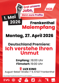 Der DGB Stadtverband Frankenthal lädt zum Mai-Empfang ins LUX Kino ein. Wir auf die Deutschland Premiere von "Ich verstehe Ihren Unmut"